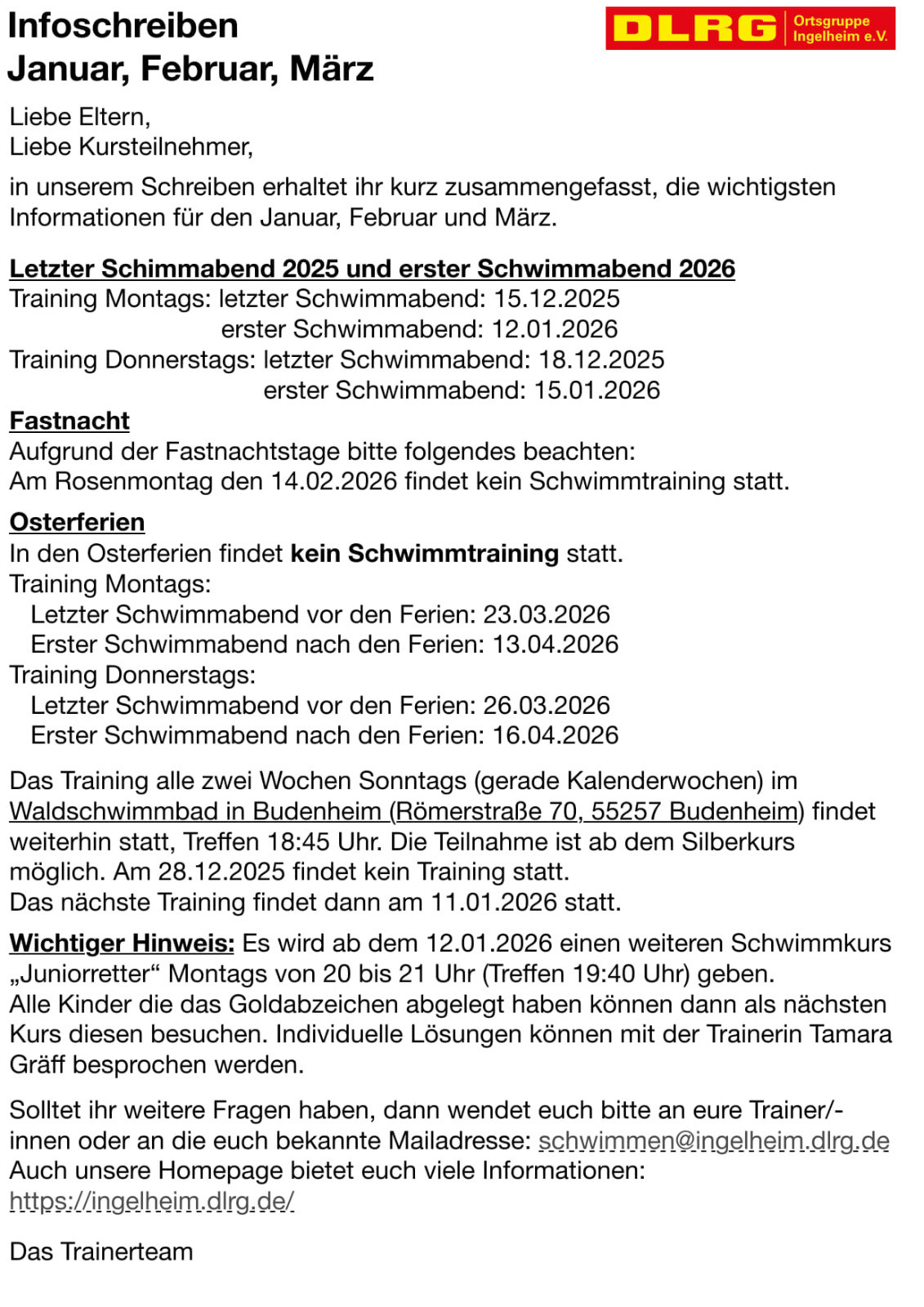 Das Training alle zwei Wochen Sonntags (gerade Kalenderwochen) im Waldschwimmbad in Budenheim (Römerstraße 70, 55257 Budenheim) findet weiterhin statt, Treffen 18:45 Uhr. Die Teilnahme ist ab dem Silberkurs möglich. Am 28.12.2025 findet kein Training statt. Das nächste Training findet dann am 11.01.2026 statt.
